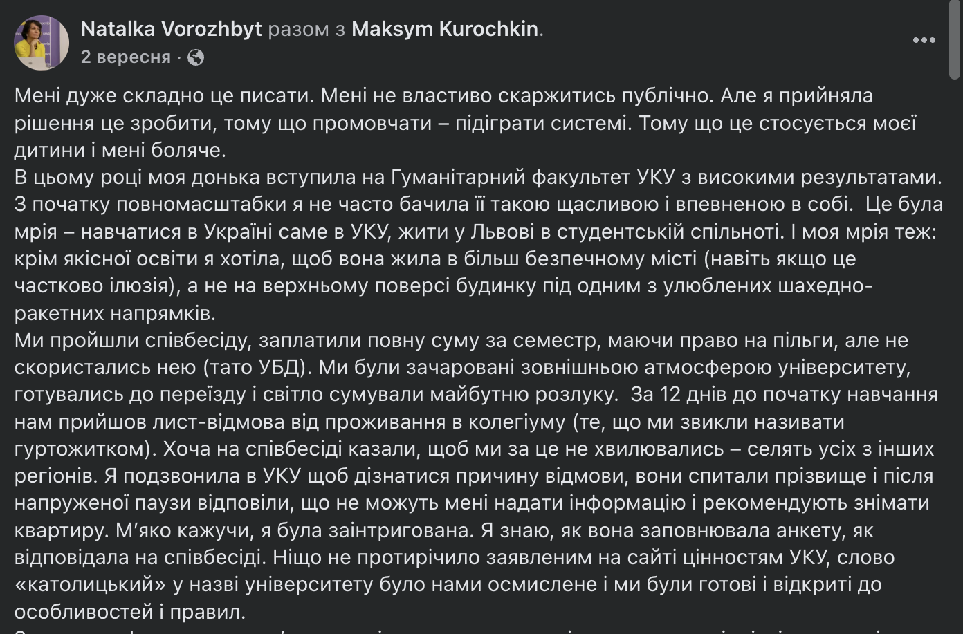 «… цей прапорець, який для неї означає толерантність і людяність, демократичність, прийняття світу в його різних фарбах, став причиною відмови проживання в колегіумі, який не є монастирем чи сектою, а належить до навчального закладу. Тобто, вдумайтесь. За 12 днів до початку навчання ви дізнаєтеся, що ваша неповнолітня дитина не може жити в гуртожитку через дискримінацію і вам пропонується орендувати квартиру за свій рахунок», – обурилася режисерка.