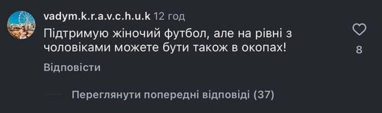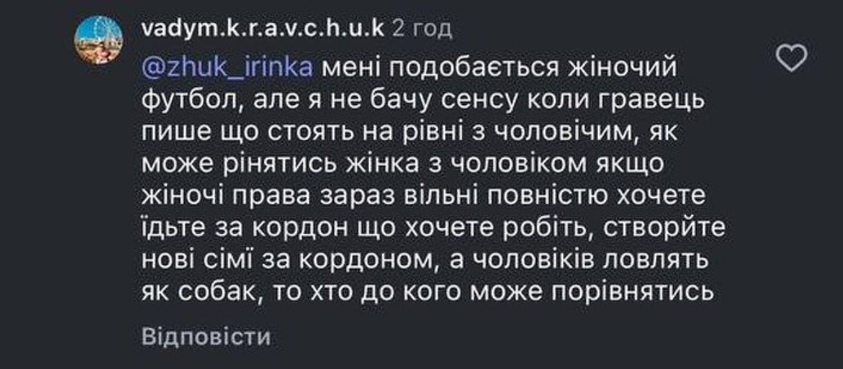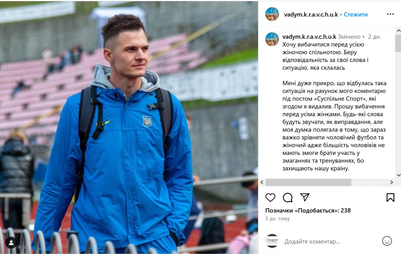 В коментарях під постом «Суспільне Спорт» в Instagram, в якому жіноча збірна України з футболу засудила сексистські висловлювання президента «Інгульця» Олександра Поворознюка, стрибун у висоту Вадим Кравчук написав, що «не рівняється жінка з чоловіком».