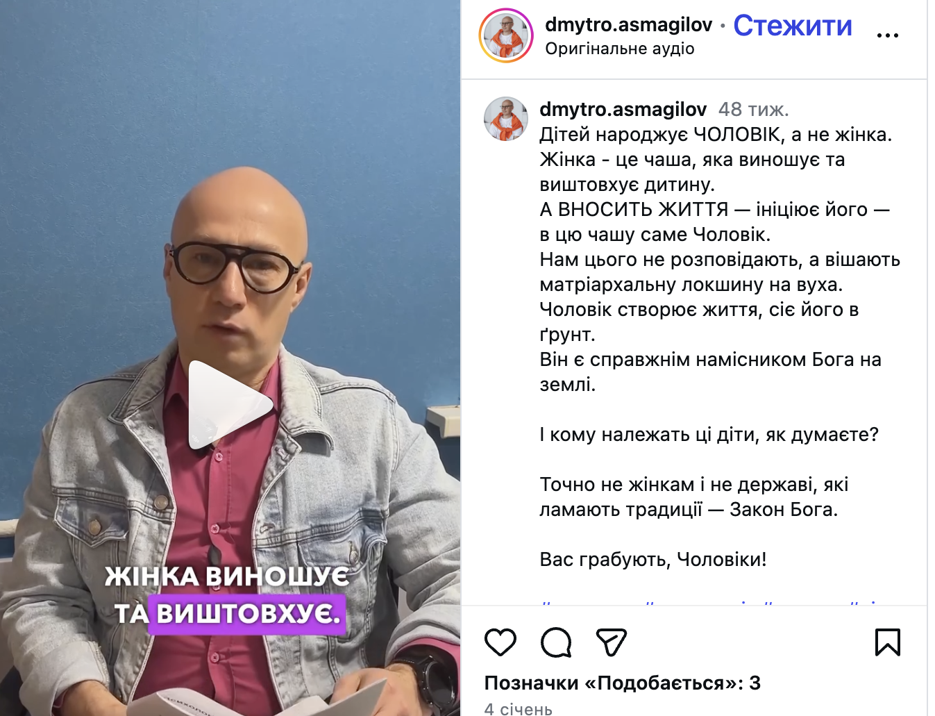 Все ще живете з архаїчною думкою, що народжують дітей жінки? Сучасних «психологів» на вас немає! Ось, наприклад, Дмитро Асмагілов опублікував «шедевральне» відео, в якому стверджує, що «… Жінка - це чаша, яка виношує та виштовхує дитину. А ВНОСИТЬ ЖИТТЯ — ініціює його — в цю чашу саме Чоловік». На думку «психолога» чоловіків грабують і «вішають матріархальну локшину на вуха».
