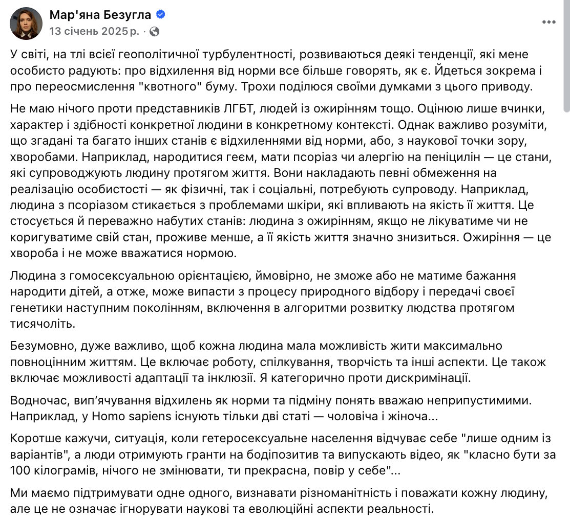 Так от і в цьому випадку. Хоч Безугла і пише, що не має «нічого проти представників ЛГБТ, людей із ожирінням тощо», весь її пост далі, напічканий зневажливими думками, перекреслює те, з чого вона починає.
