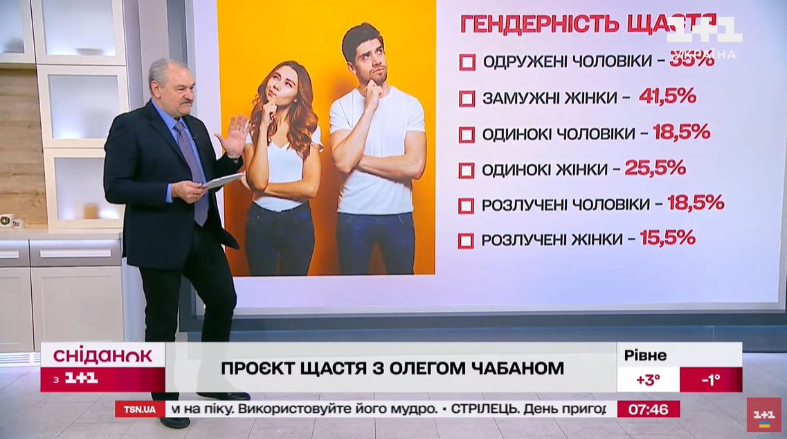 Крім того, Чабан навів статистику (джерело якої невідоме), згідно з якою, найщасливіші люди – «замужні жінки»