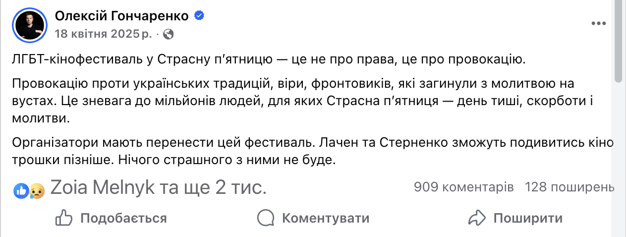 «ЛГБТ-кінофестиваль у Страсну п’ятницю — це не про права, це про провокацію», — написав депутат ВРУ, колишній «регіонал» Олексій Гончаренко.