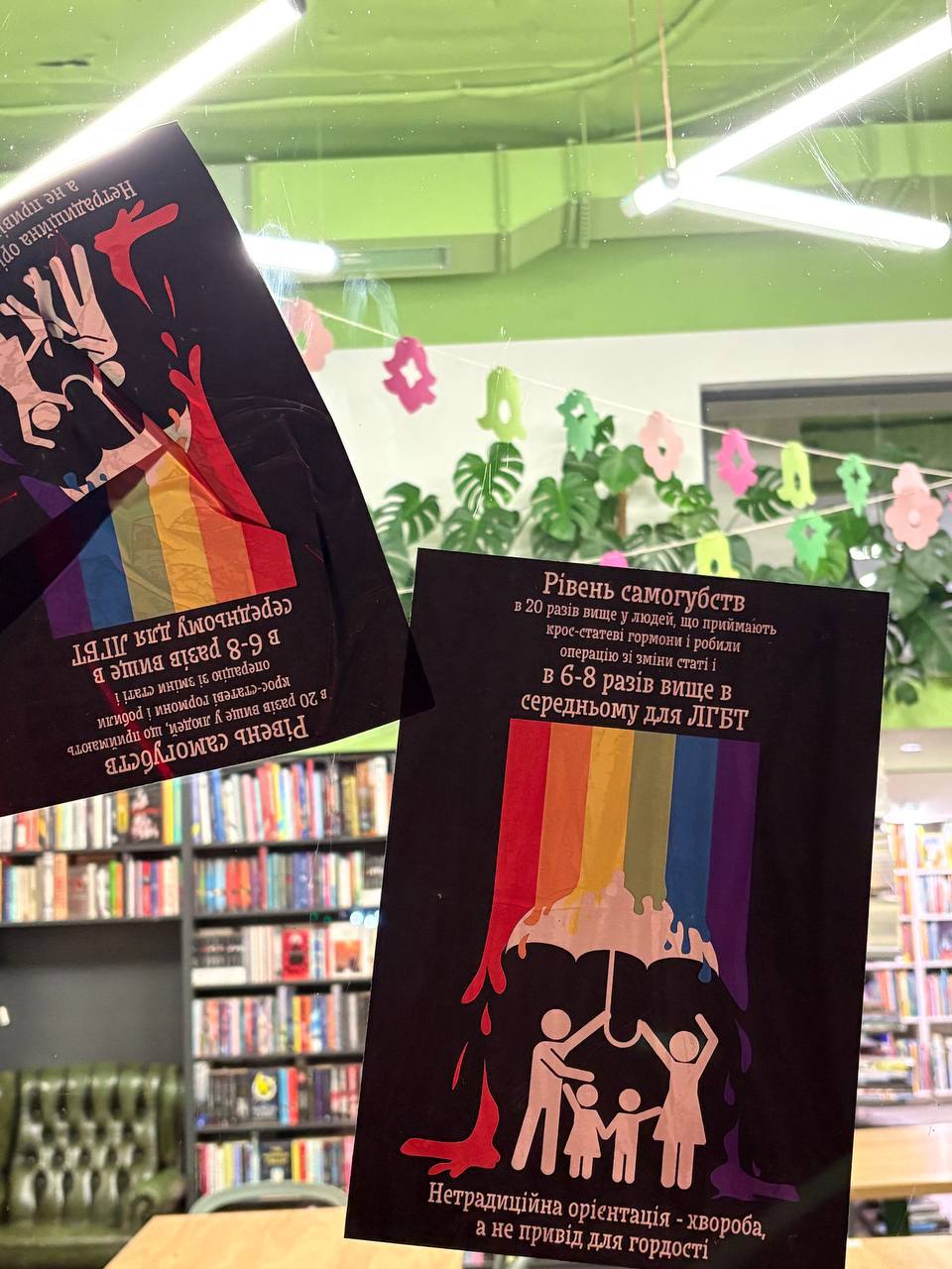 Наприкінці вересня чоловіки в масках обклеїли вікна київської книгарні «Сенс» гомофобними листівками. На них були заяви, які нібито доводили «небезпечність» ЛГБТІК-людей та негативні наслідки гормональної терапії і трансгендерного переходу.