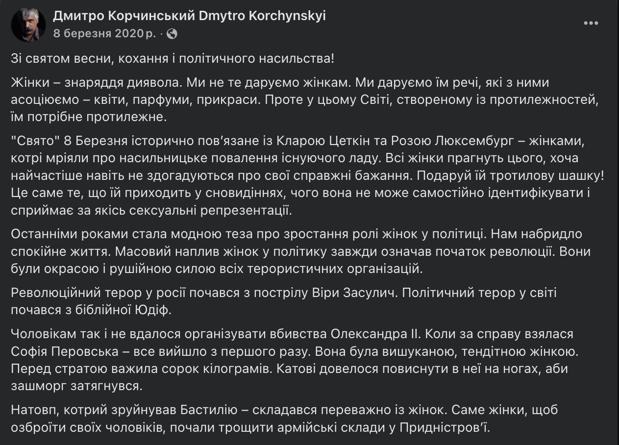 Тому ми б хотіли запропонувати пану Дмитру святкувати цю дату в компанії власних масних натяків і невігластва. А до реальних жінок таких горелікарів краще не підпускати.