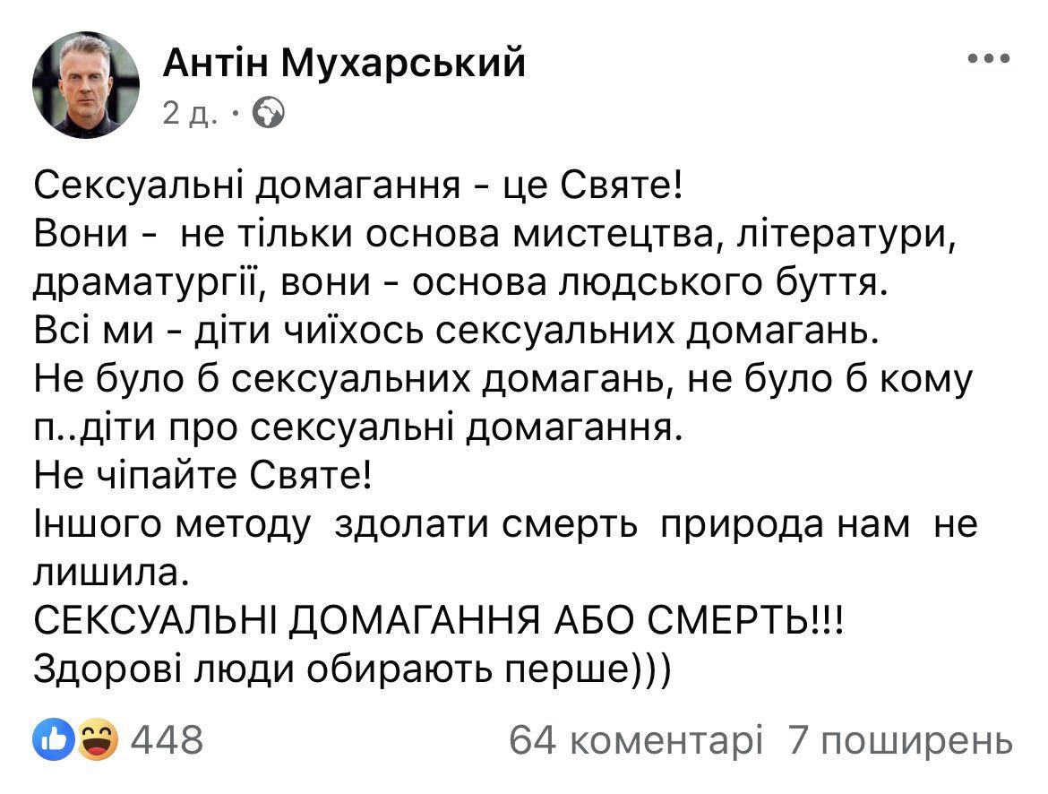 Це так Мухарський опосередковано висловився щодо публічних звинувачень викладачів Андрія Білоуса та Юрія Висоцького. Попри хвилю критики в соцмережах за цю позицію, Мухарський не став видаляти свій допис, підкресливши, що його думка базується на досвіді роботи в театральній сфері. Не знали, що в театрі існує професія мерзотника.