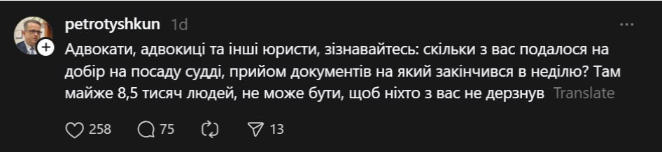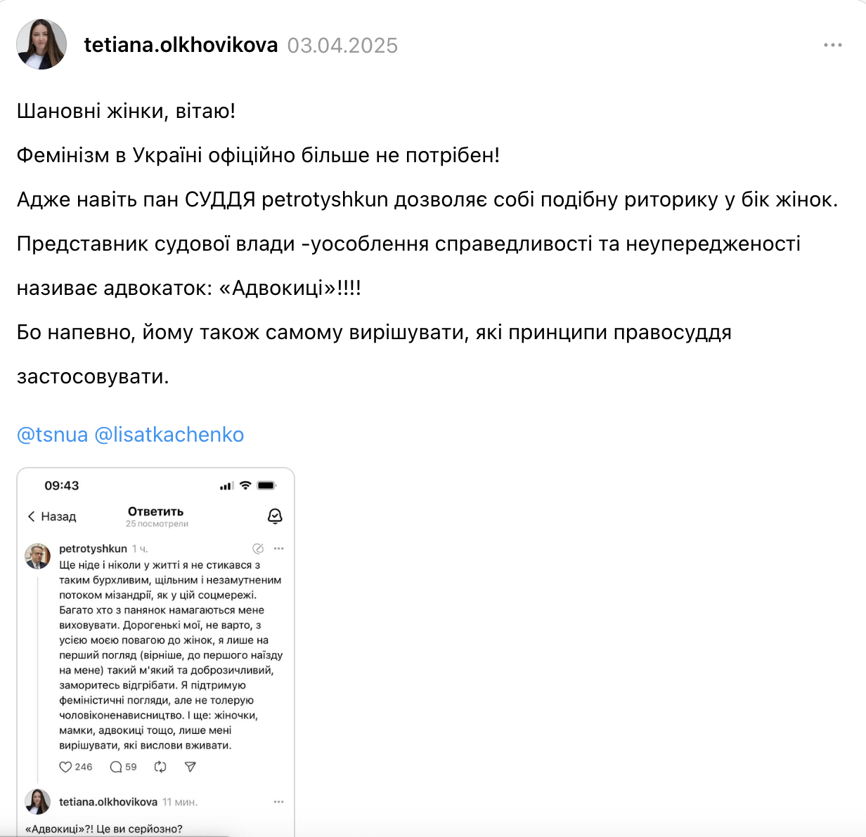 Суддя з Рівненщини Петро Тишкун у дописі в Threads згадав адвокат_ів і юрист_ів, а жінок у цій професії ласкаво охрестив «адвокицями».