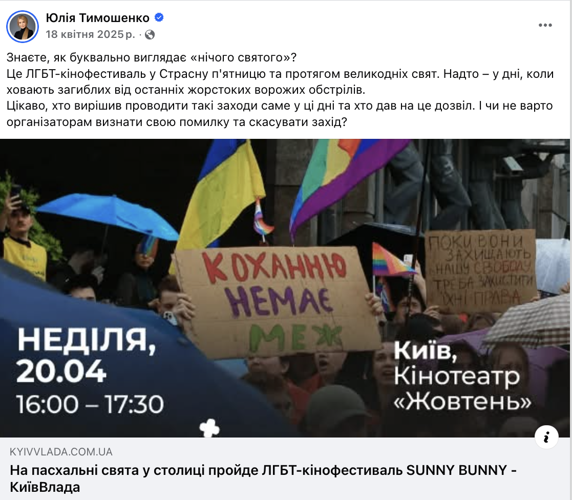 «Знаєте, як буквально виглядає «нічого святого»? Це ЛГБТ-кінофестиваль у Страсну п'ятницю та протягом великодніх свят. Надто – у дні, коли ховають загиблих від останніх жорстоких ворожих обстрілів. Цікаво, хто вирішив проводити такі заходи саме у ці дні та хто дав на це дозвіл. І чи не варто організаторам визнати свою помилку та скасувати захід?», – написала вона.