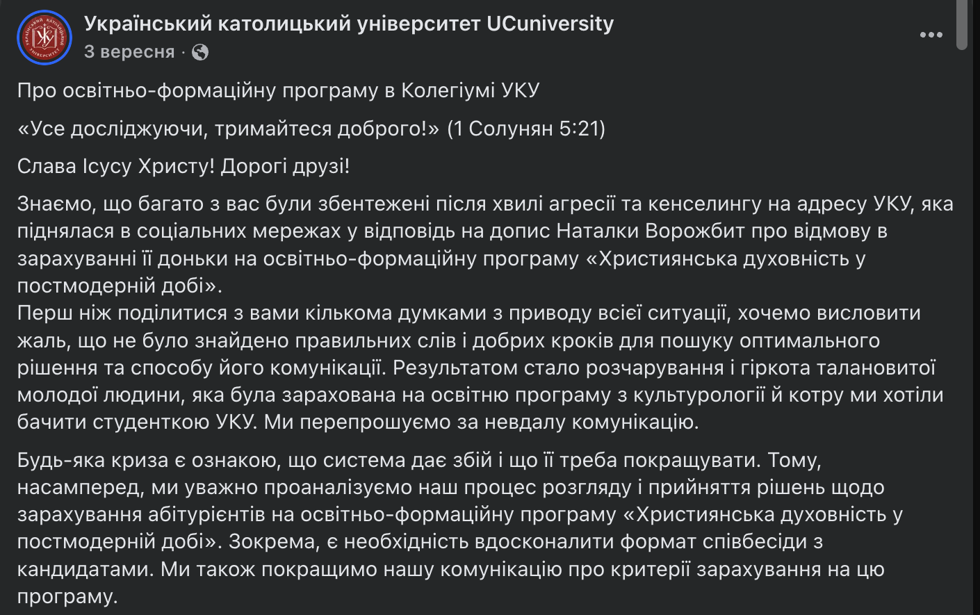 Те, що саме ЛГБТ-прапорець став причиною відмови, підтвердили і в УКУ. А також опублікували пост у якому вибачились за невдалу комунікацію, але водночас заявили, що як католицький університет, «в інституційних поглядах УКУ дотримується біблійного вчення про людину, яку Господь сотворив чоловіком і жінкою».