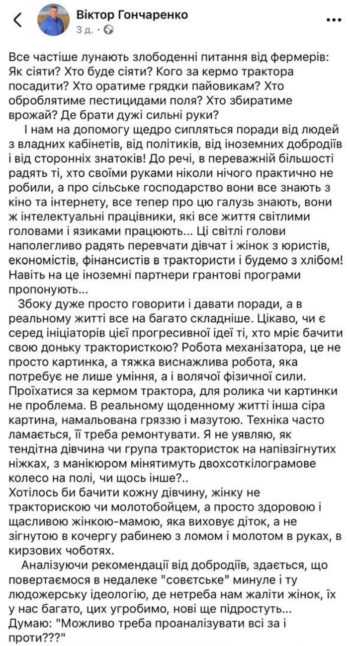 Віктор Гончаренко, президент Асоціації фермерів та приватних землевласників України, поділився на своїй сторінці роздумами про стан нації. Він змалював образ жінки як фізично нездатної до важкої праці. Чим заперечив професійну мобільність, багатогранність здібностей і право на вільний вибір.