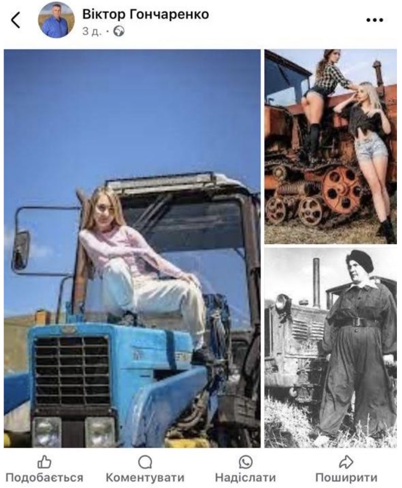 Гончаренко відтворює застарілі стереотипи про «тендітність» жінок та протиставляє їх «справжній» фізичній праці, водночас ігноруючи очевидний факт: сучасна аграрна техніка, як і весь агросектор, істотно змінилися. Робота механізаторки у XXI столітті – це не радянські уявлення про лом і мазут, а професія, що передбачає технічну компетентність, аналітичні навички та сучасну інфраструктуру.