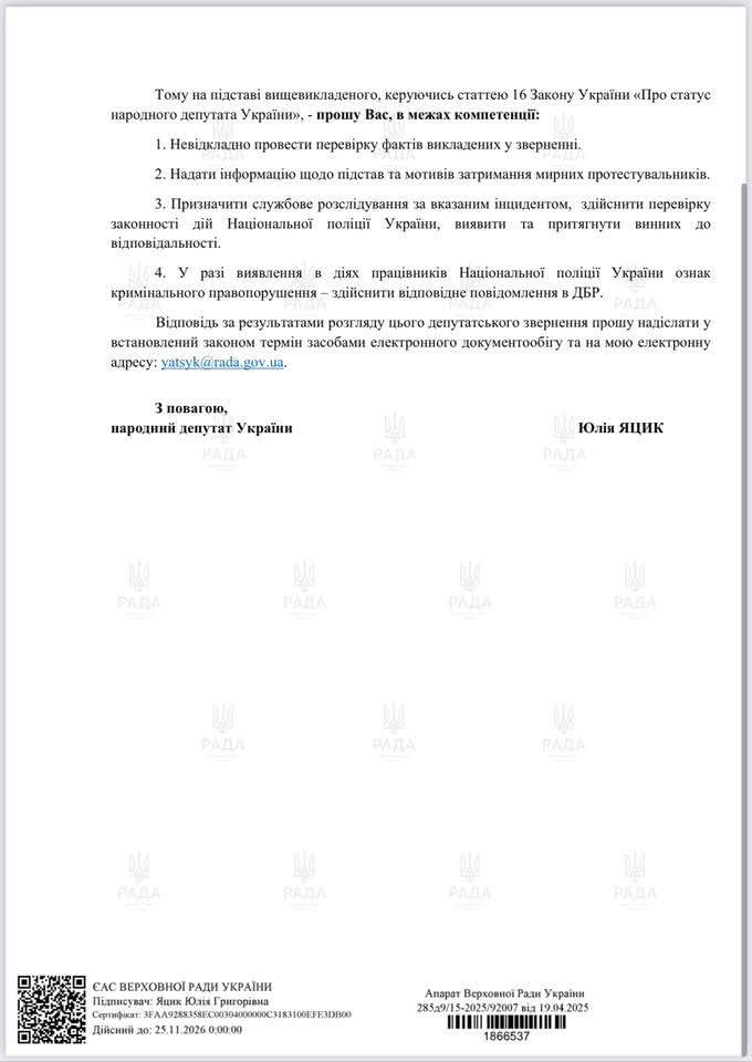 Яцик написала депутатське звернення до міністра внутрішніх справ Ігоря Клименка з вимогою пояснити законність затримання. На її думку, затримати протестувальників було «централізованою вказівкою, а не самоуправством поліцейських».