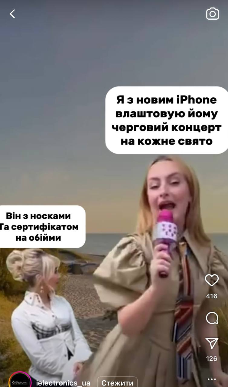 Це нам нагадало ситуацію, коли твій родич розповідає непристойний анекдот і сам над ним сміється, поки всі інші дивляться в підлогу від сорому. Десь такого ж рівня реклама у цьому магазині, адже посилаються вони до старого наративу про оральний секс заради покупки айфону. Жінці від чоловіка, звичайно ж.