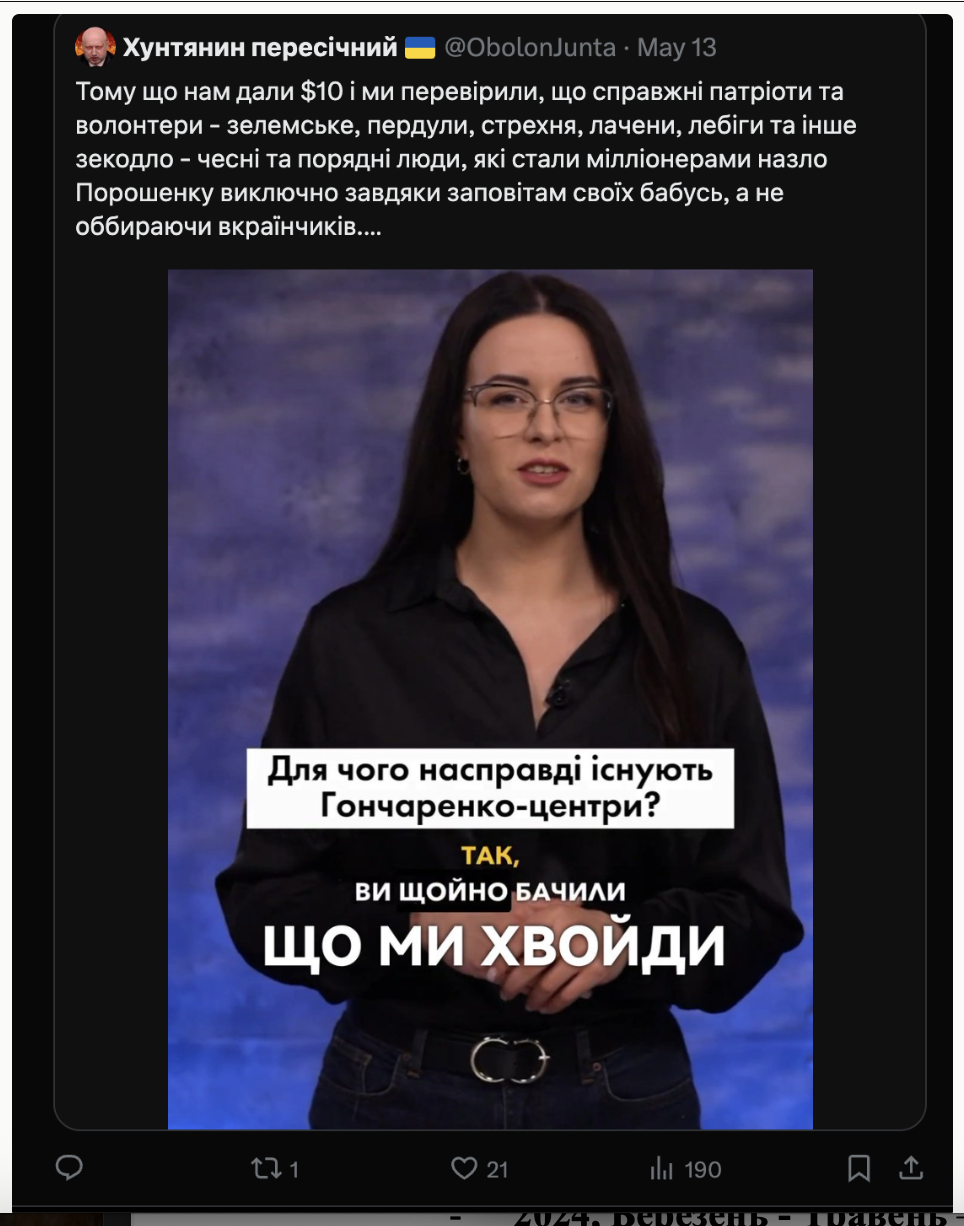 «Олексію Гончаренко — пора на фронт, замінити когось з хлопців, перш ніж писати бридкий пафос про всіх нас, хто пройшов війну чи загинув. Ви і пальцем не поворухнули, щоб військові геї та лесбійки отримали рівні з іншими права!»
