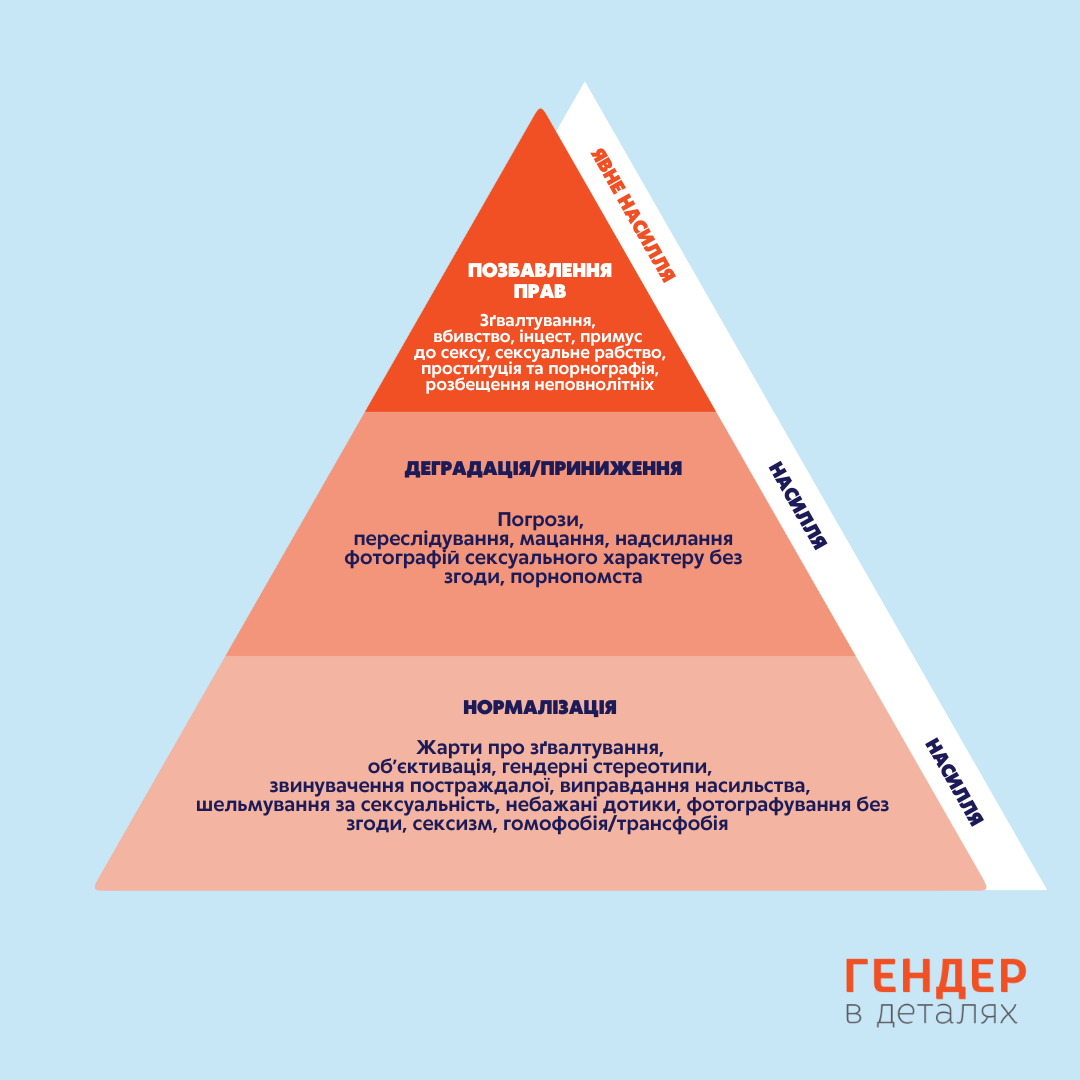 Розпочинаємо цей матеріал не просто з випадків сексизму, а з найжорстокіших і найгірших наслідків цього сексизму. Згідно з пірамідою насильства, навіть на перший погляд «невинні» жарти (в основі піраміди) призводять до того, що в суспільстві толеруються насильницькі дії щодо групи, над якою жартують. Таким чином насильства стає все більше (вершина піраміди).