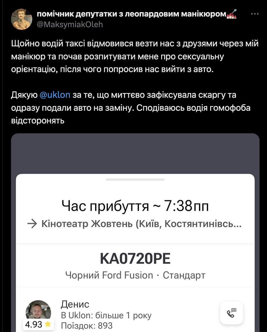 Леопардовий манікюр Олега Максимʼяка – помічника народної депутатки Марії Мезенцевої, проєктного менеджера організації «Точка опори» – став причиною того, що таксист Uklon висадив його з машини.